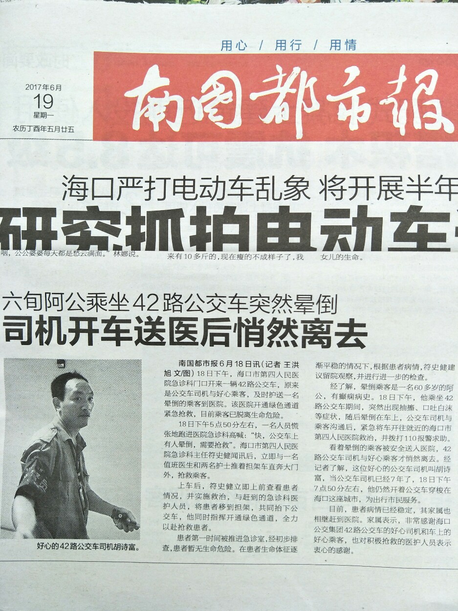 事出突然,駕駛員胡詩富聽到車內(nèi)的乘客的呼喊后,立即路邊???,并上前查看老人情況。胡師傅見老人倒在車廂地板上,不停抽畜,現(xiàn)場情況緊急。胡師傅立即拔打120急救電話和110報警電話,分別請求救援,120工作人員告知由于高峰時期等原因暫時未能派車,還需等待。為救人,胡師傅便立即向42路線長黃明朗和車上其它乘客請示是否能直接送醫(yī),在得到許可后,胡師傅直接調(diào)轉(zhuǎn)車頭開往最近醫(yī)院海口市第四人民醫(yī)院。